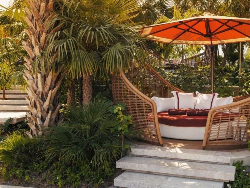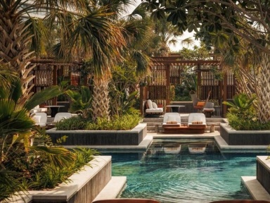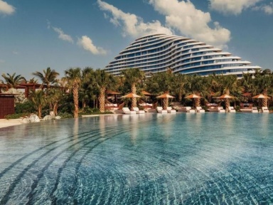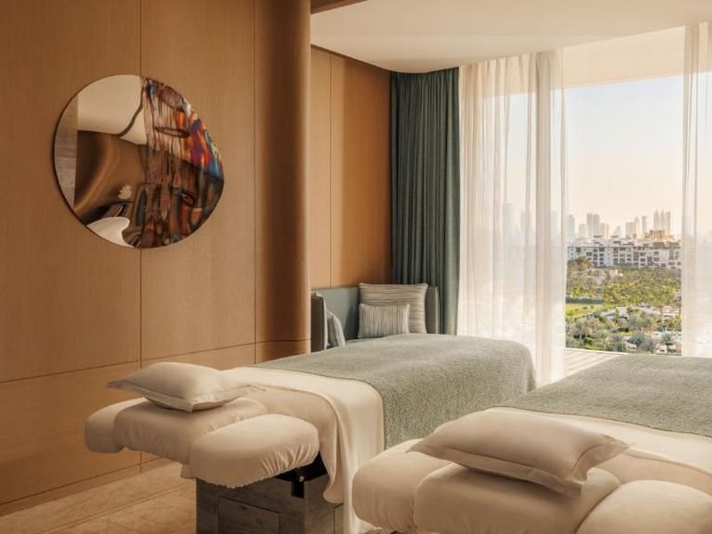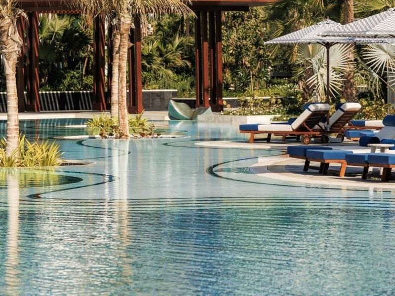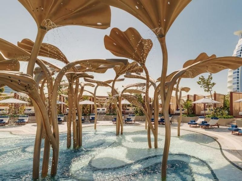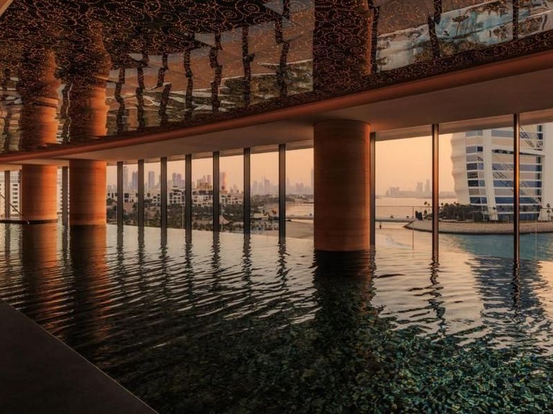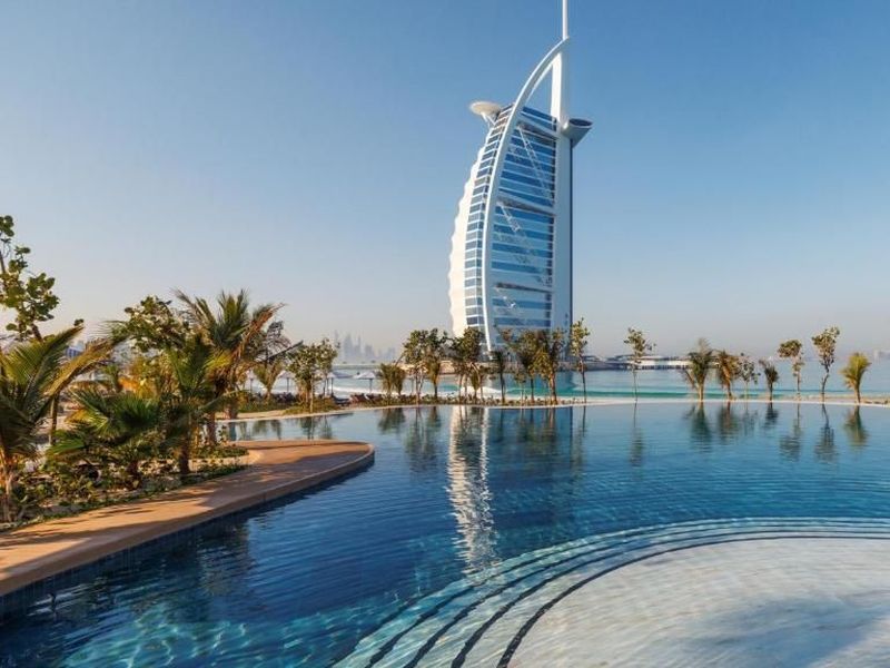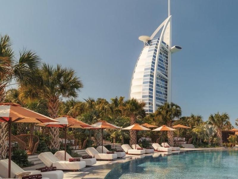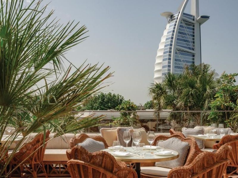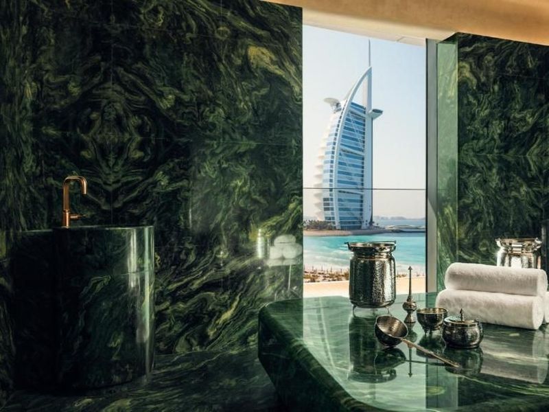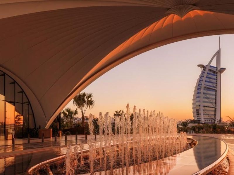 Отель расположен на частном участке береговой линии в 24 километрах от международного аэропорта Дубая. Он находится на живописной набережной, с прямым выходом к Персидскому заливу и панорамным видом на Бурдж-эль-Араб. Территория окружена зрелой зеленью: оливковыми деревьями, пальмами и кустарниками, что создаёт ощущение уединённого курорта внутри мегаполиса. Отсюда легко добраться как до центра Дубая, так и до спокойных прибрежных зон — пешком можно прогуляться до соседнего публичного пляжа или пристани.