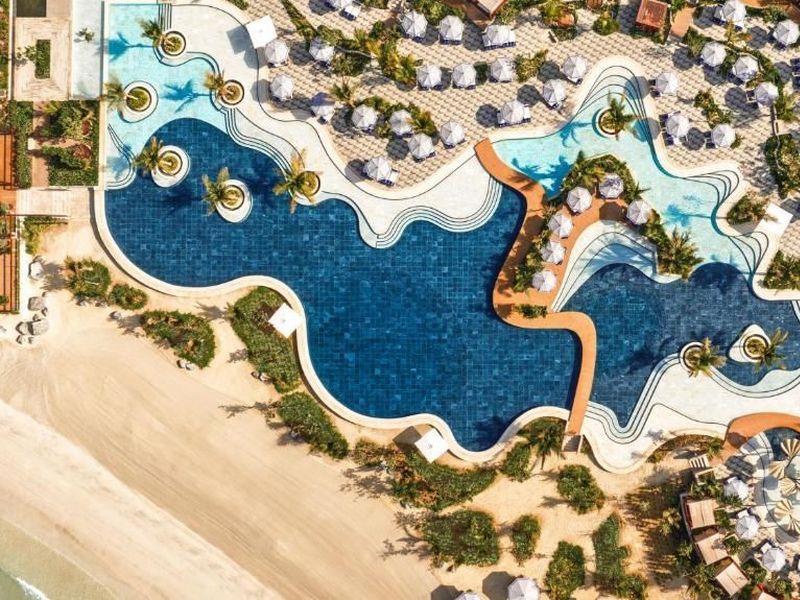Территория продумана до мелочей: плавные изгибы дорожек, округлые формы архитектуры, открытые пространства без ощущения тесноты. Всего на территории пять бассейнов, включая взрослый бассейн у ресторана Iliana с удобными шезлонгами и отдельную зону Kinugawa — тихую, без детей, с атмосферой уединённого спа-курорта.