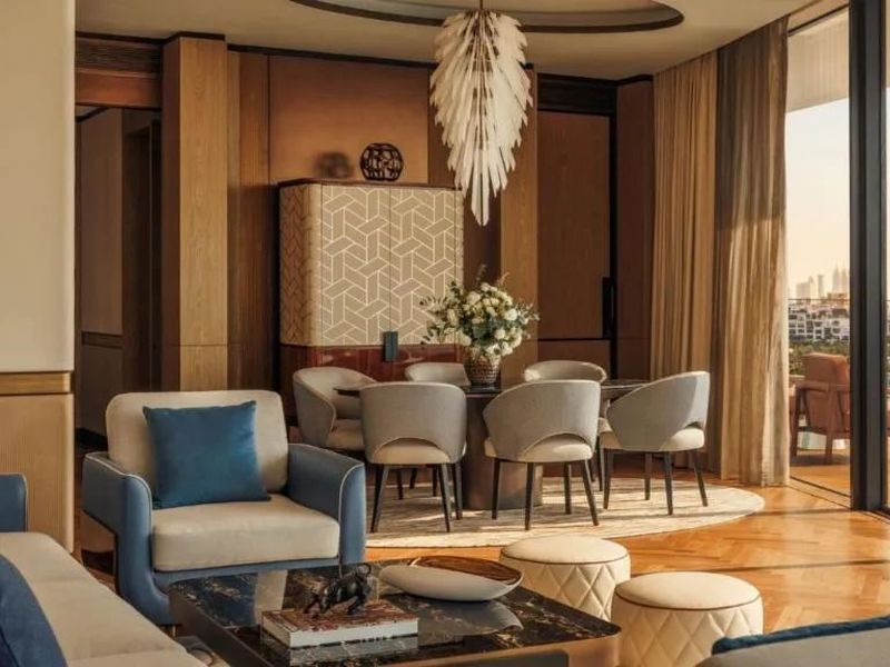 Люкс с 5 спальнями, площадь люкса: 1048 кв. м. , 5 кроватей king-size, панорамный вид 180 гр. от Jumeirah Burj Al Arab до Burj Khalifa, размещение: 15 взрослых + 5 детей до 12 лет , персональный батлер , виниловый проигрыватель , телескоп для наблюдения за звездами, отдельная кухня, зона отдыха с барной стойкой , обеденная зона на 12 человек, комната для няни, большая панорамная терраса